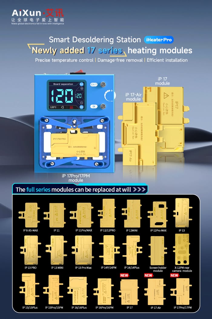 AiXun i. Pro sökme istasyonu, deforme olmuş anakartı düzeltmek için iletken olan dört tam açılı toka ile yeni yükseltilir. IPhone x'dan 14 promax'a kadar genel seri modülleri destekler ve 14 serisi yakında başlayacak... Ayrıca Android çip ve CPU düzeltmesini de destekler. Bu akıllı ön ısıtma istasyonu 9 avantajı vardır: 2.4 inç HD ekran, dahili soğutma fanı, uzaktan yazılım yükseltme, geri sayım ayarı, sıcaklık eğrisi ekran, hızlı ısıtma, sıcaklık bellek, destek 110V-220V, modüler uzatma. Özellikle mobil anakart bakımına uygulanan katmanlı bir ısıtma platformu.